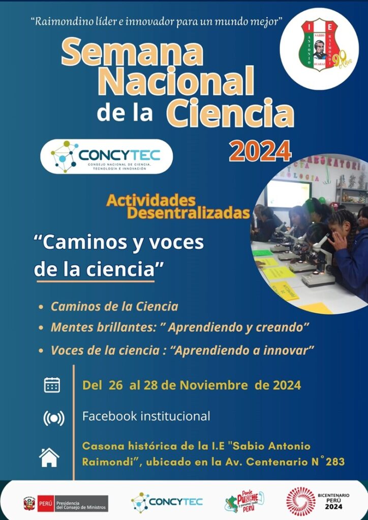 La Institución Educativa Publica “SABIO ANTONIO RAIMONDI”-Huaraz, a través de la Plana Directiva, personal jerárquico, docentes, estudiantes  y padres de familia en sus 90 años de vida institucional y en coordinación con el Consejo Nacional de Ciencia y Tecnología(CONCYTEC), forman  parte  de la SEMANA NACIONAL DE LA CIENCIA – 2024, este evento tiene como propósito de promover, incentivar, crear, innovar  y  fomentar la curiosidad, la creatividad y el  pensamiento crítico en los estudiantes a través de la exploración práctica de conceptos científicos, promoviendo el aprendizaje activo y el trabajo en equipo, para formar las mentes del futuro, capaces de aportar soluciones innovadoras.