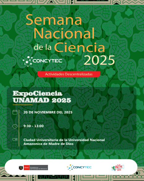 ExpoCiencia UNAMAD 2025 Universidad Nacional Amazónica de Madre de Dios La UNAMAD se suma a la Semana Nacional de la Ciencia con la “ExpoCiencia UNAMAD 2025” En el marco de la Semana Nacional de la Ciencia, promovida por el Consejo