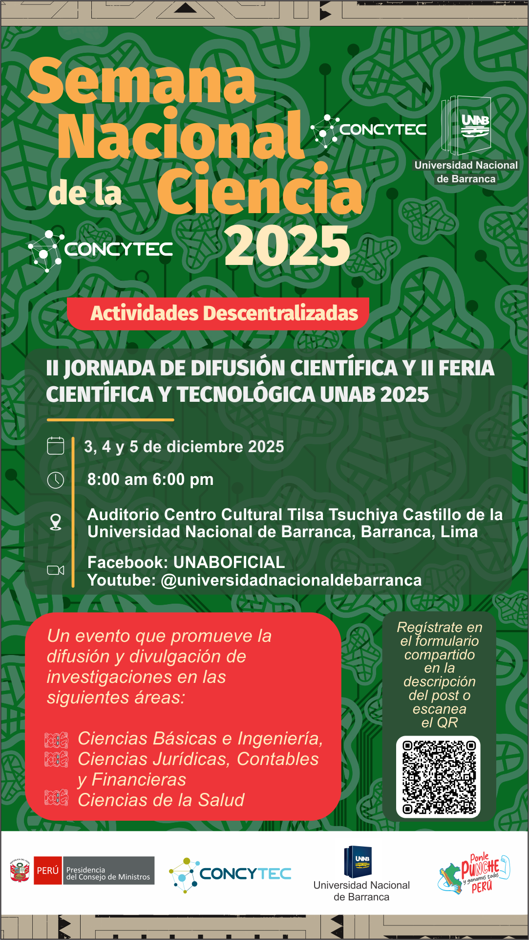 ¡Semana Nacional de la Ciencia CONCYTEC 2025 llega a la UNAB! Universidad Nacional de Barranca La Universidad Nacional de Barranca (UNAB) a través de la Vicepresidencia de Investigación te invita a dos eventos imperdibles de alto nivel de conocimiento: 🧪🔬