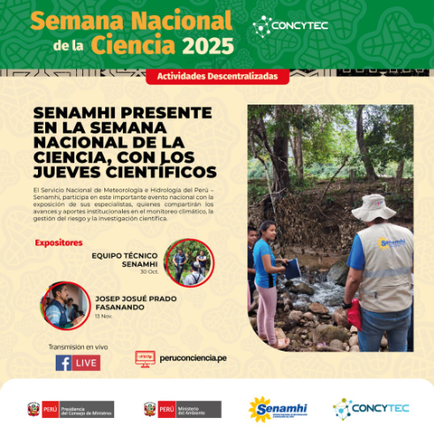 Senamhi comparte experiencias y avances científicos en la Semana Nacional de la Ciencia del Concytec Servicio Nacional de Meteorología e Hidrología del Perú El Servicio Nacional de Meteorología e Hidrología del Perú (Senamhi), organismo adscrito al Ministerio del Ambiente, participa