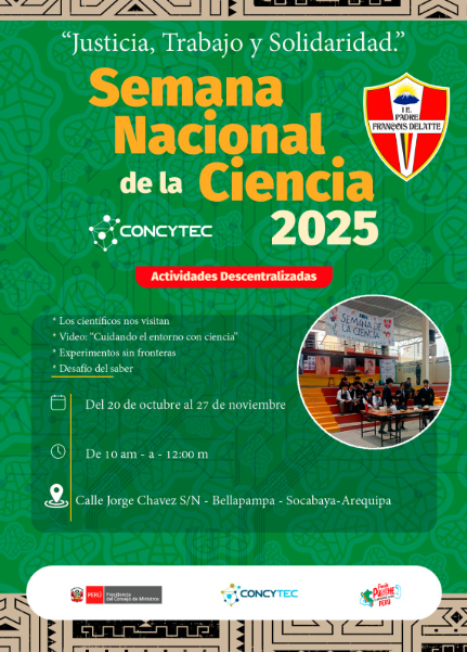 Semana de la Ciencia Sanmartina 2025 IE San Martín de Socabaya En la IE “San Martín de Socabaya” de JEC desde el año 2024 se trabaja la semana de la ciencia de forma interna. Por el presente año la IE