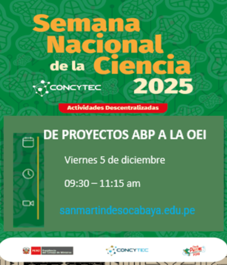 En la IE “San Martín de Socabaya” de JEC desde el año 2024 se trabaja la semana de la ciencia de forma interna. Por el presente año la IE a través del Club de Ciencias “SMS EN ACCION” y “CLUB FORESTAL” en coordinación con el Consejo Nacional de Ciencia, Tecnología e Innovación (CONCYTEC) celebramos la SEMANA DE LA CIENCIA SANMARTINA 2025, consideramos un evento que tiene como propósito concientizar, motivar y difundir los trabajos ganados con FONDEP de Investigación Científica, Tecnología e Innovación desde el año 2015 involucrándose toda la comunidad educativa en los proyectos que son sustentables y sostenibles a la fecha.